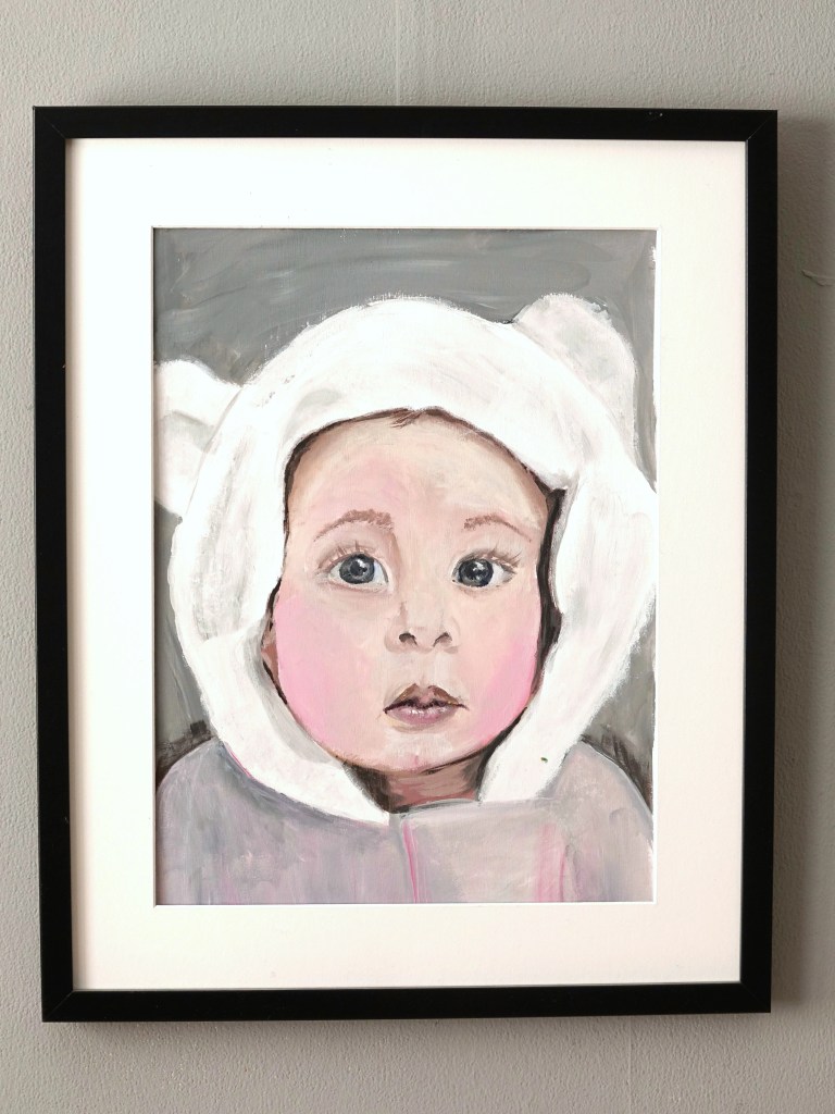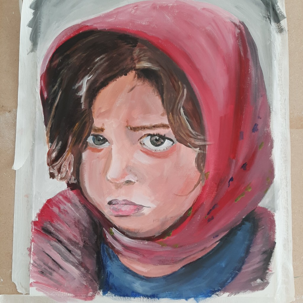 Natuurlijk voelt het ook vreemd en verdrietig. Het schilderen van kinderen waarvan je niet weet of ze nog leven of dat ze volgende week nog leven. Er zijn kinderfoto’s bij waar zoveel verdriet te zien is op het gezicht dat je denkt dit kan ik onmogelijk weergeven maar je weet dat is juist wat je wilt weergeven. En al schilderende verlies ik mezelf in dat trieste gezicht en moet af en toe even weglopen om niet te emotioneel te worden. Zoals de baby Lauren Al-Koumi, haar ouders waren gewoon leraar en ingenieur, haar oom die schrijft dat haar lach je hart steelt. Of de 5 jaar oude Karam Mahmoud Sawwaf en de 6 jaar oude Rahaf. Gewoon kinderen.