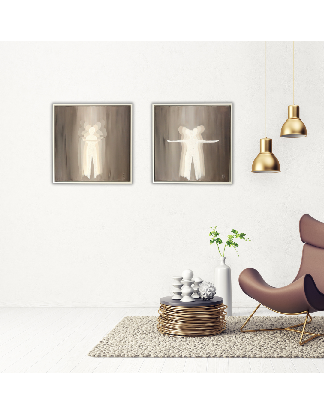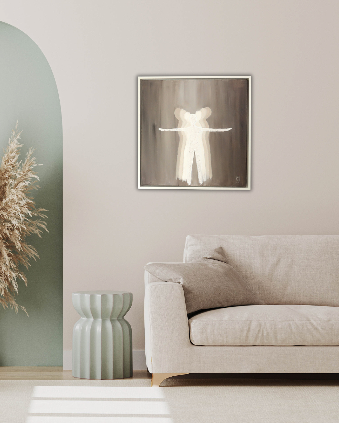 “The Guardian” is het eerste schilderij in de serie Descent of Light, en staat symbool voor innerlijke bescherming. De voorste figuur spreidt zijn armen wijd, krachtig en open. Achter hem staan anderen, gedragen en beschermd. Deze houding roept het beeld op van een lichtdrager, iemand die voor anderen staat, niet uit macht, maar vanuit liefdevolle aanwezigheid.