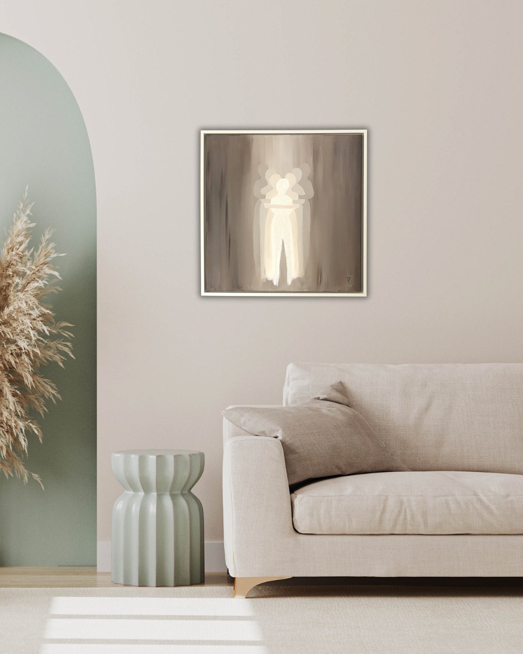 Dit werk nodigt de kijker uit stil te staan bij de kracht van verbondenheid. In een wereld vol verandering, Sacred Union herinnert ons eraan hoe helend het is om écht contact te maken. Niet alleen fysiek, maar ook vanuit je ziel. De lichtstroom die tussen de figuren stroomt, suggereert dat liefde en steun een energiebron vormen waaruit alles verder kan groeien.