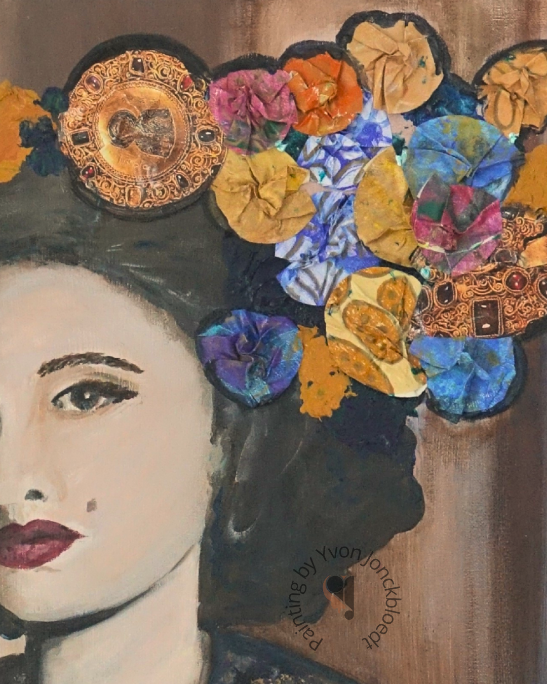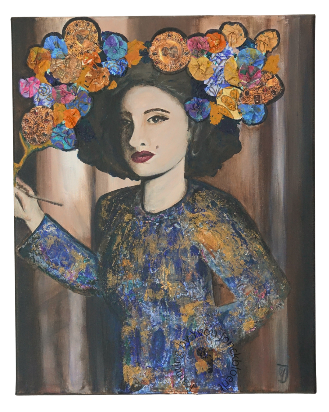 De vrouw is afgebeeld in een expressieve schilderspose, een subtiele knipoog naar haar creatieve kracht. Haar haar is versierd met collage papieren bloemen in warme gele en koele blauwtinten, met hier en daar goudelementen. Deze papiercollage-elementen zorgen voor een levendig contrast en geven het portret een extra artistieke dimensie.