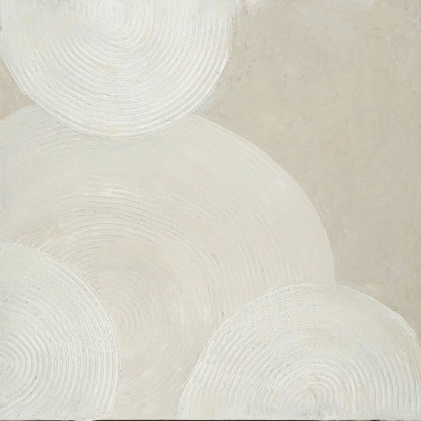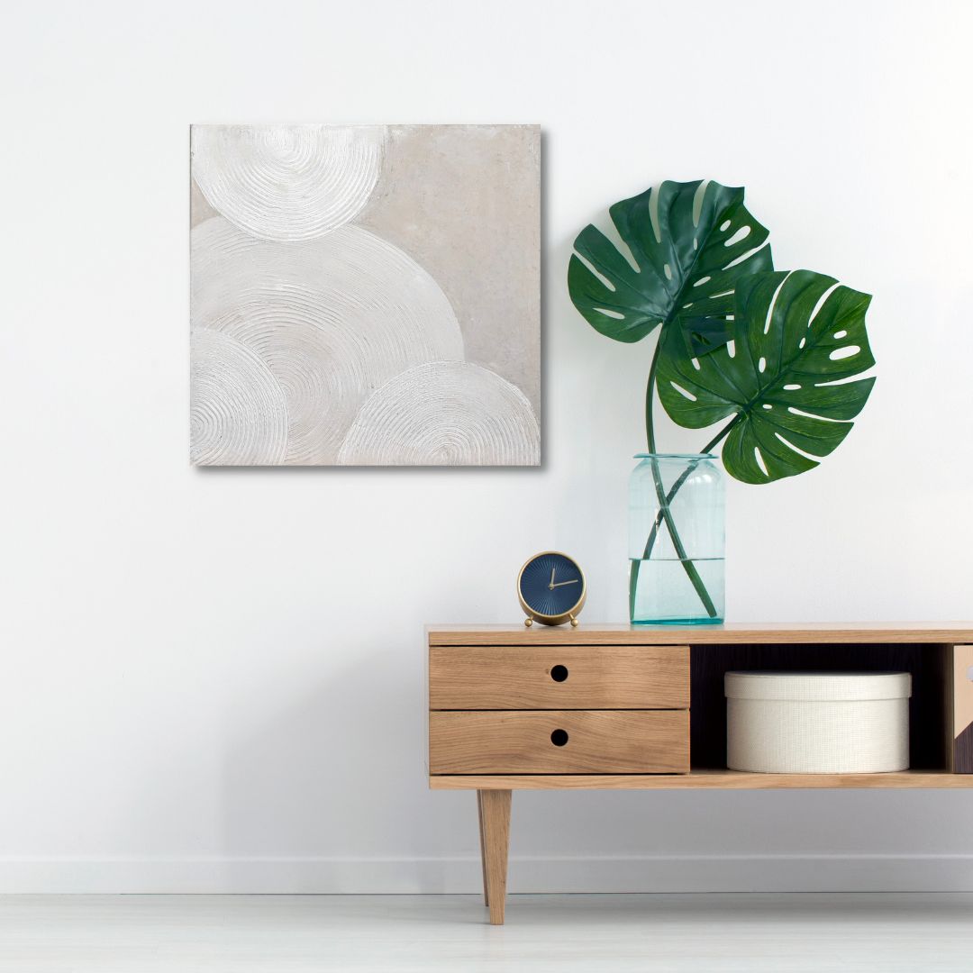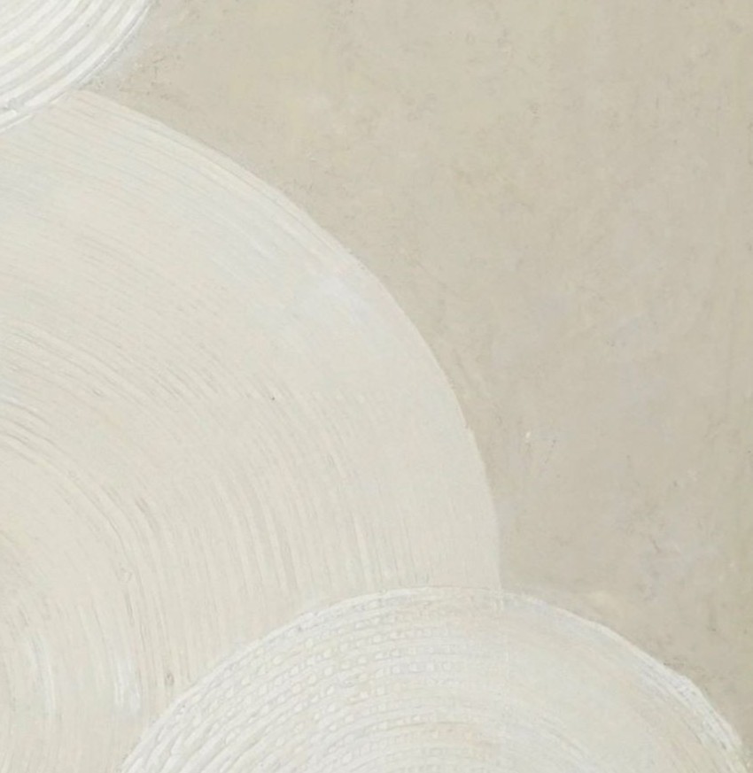 Dit textuur schilderij heeft speelse ronde vormen. De aardse kleuren passen mooi bij een Japandi of Wabi Sabi interieur.