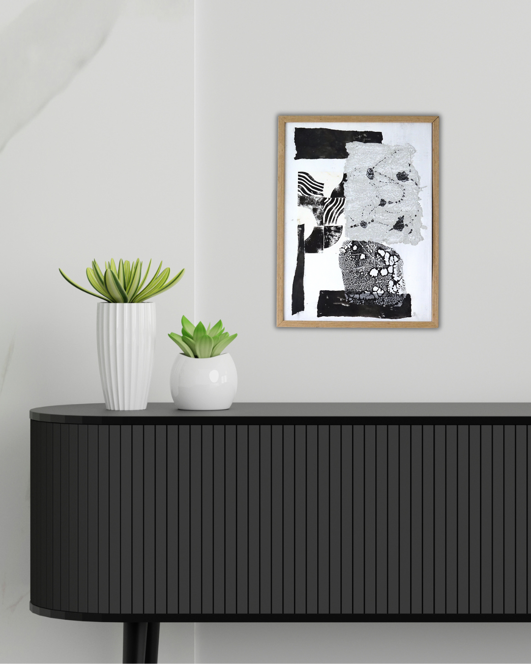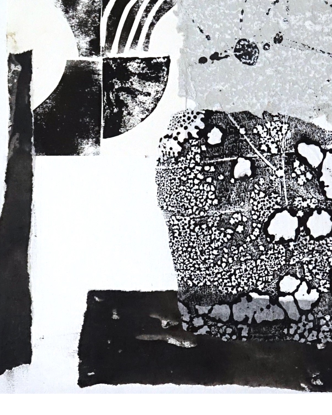 Composition in black and white is een compositie van verschillende structuren. Het papier dat hiervoor is gebruikt is gerecycled papier en handgeschept papier. De ondergrond is gerecycled karton. Hierdoor is een mooi duurzaam schilderij ontstaan. Daarop is met verschillende mixed media technieken en verschillende verfmaterialen gewerkt om zo een bijzonder effect te creëren.