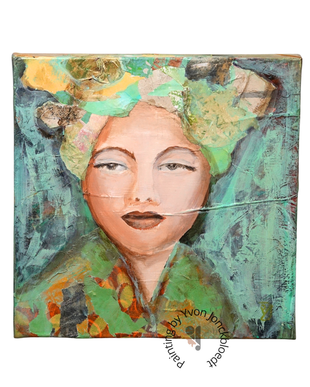 Klein 3D collage art schilderij opgebouwd uit lagen papier en acrylverf. De dikke randen zijn geschilderd in goud en groen metallic.
