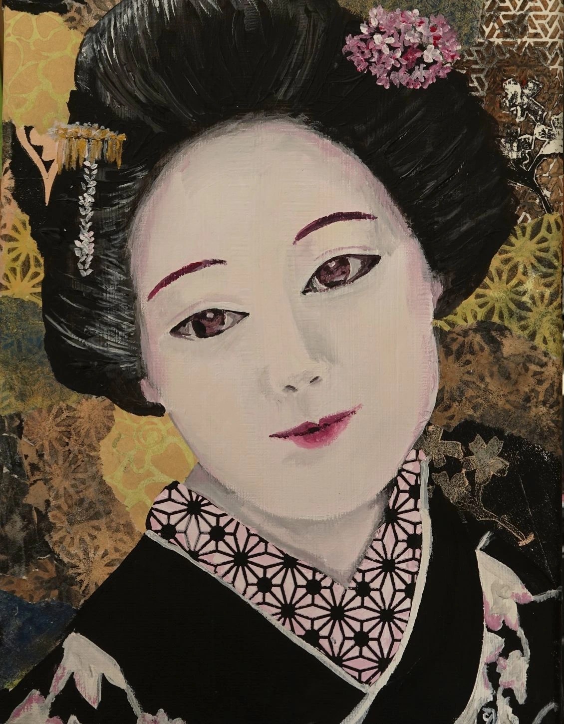 Het idee van de smiling Geisha is ontstaan door het muziekdoosje in mijn atelier. Het muziek doosje is jarenlang in het bezit geweest van mijn ouders. Het heeft voor mij sentimentele waarde. Op een dag viel mijn oog erop en dacht daar wil ik iets mee. Op het doosje staat een Geisha in klederdracht die glimlacht. Een mysterieuze glimlach die hoort bij een echte Geisha.
