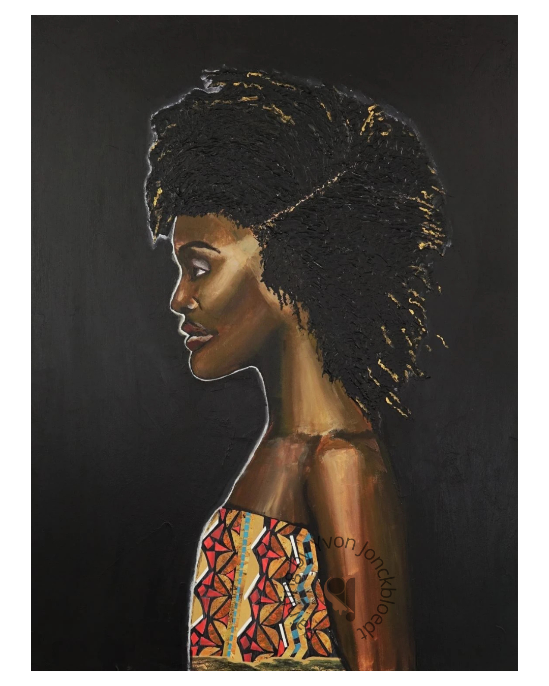 Het schilderij is een mixedmedia werk en is gemaakt met verschillende materialen.De kleding van de vrouw is een dessin gemaakt van knipsels. Haar haar heeft door een structuur bewerking een 3d effect gekregen. Hierbij heb ik geëxperimenteerd met wat structuurmateriaal bijvoorbeeld kan doen in een figuratief schilderij.